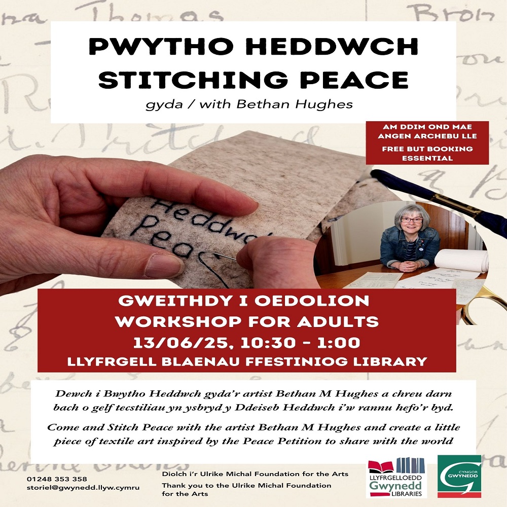 Dewch i Bwytho Heddwch gyda'r artist Bethan M Hughes a chreu tesctiliau yn ysbryd Y Ddeiseb Heddwch.