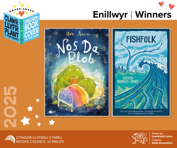 The English-language category winner was Fishfolk (Firefly Press). Cover illustration: Hannah Doyle. Author: Steven Quincey-Jones. The Welsh-language category winner was Nos Da Blob (Y Lolfa). Cover Illustration: Huw Aaron. Cover design: Opal Roengchai. Author: Huw Aaron.